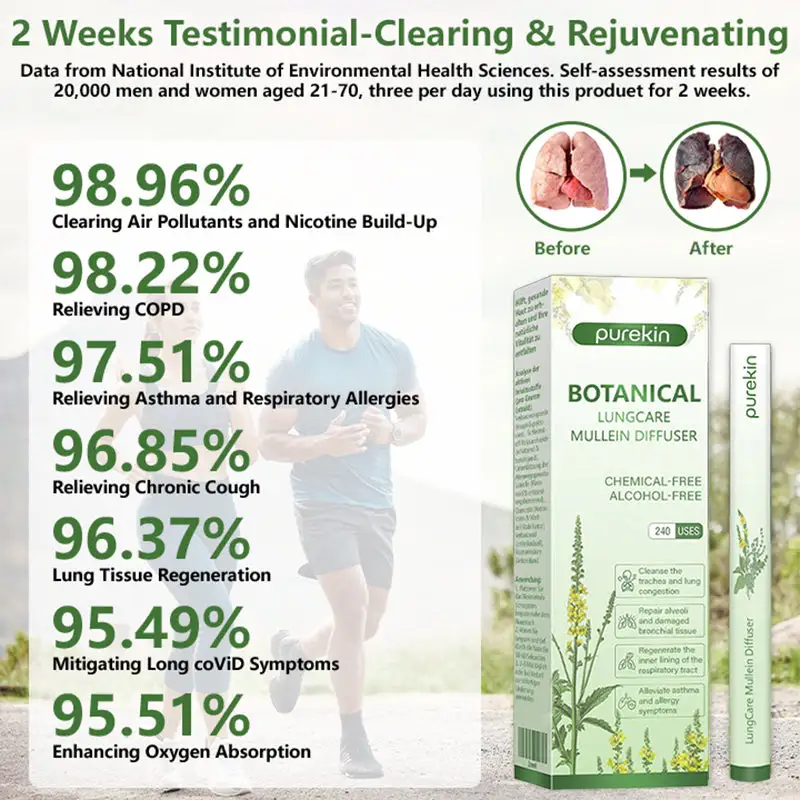 Customer studies show Purekin Botanical LungCare Mullein Diffuser delivers powerful lung-supporting effects, especially for those exposed to smoking, industrial dust, and pollution. Users reported dramatic improvement in persistent coughing, shortness of breath, phlegm, and chest tightness.